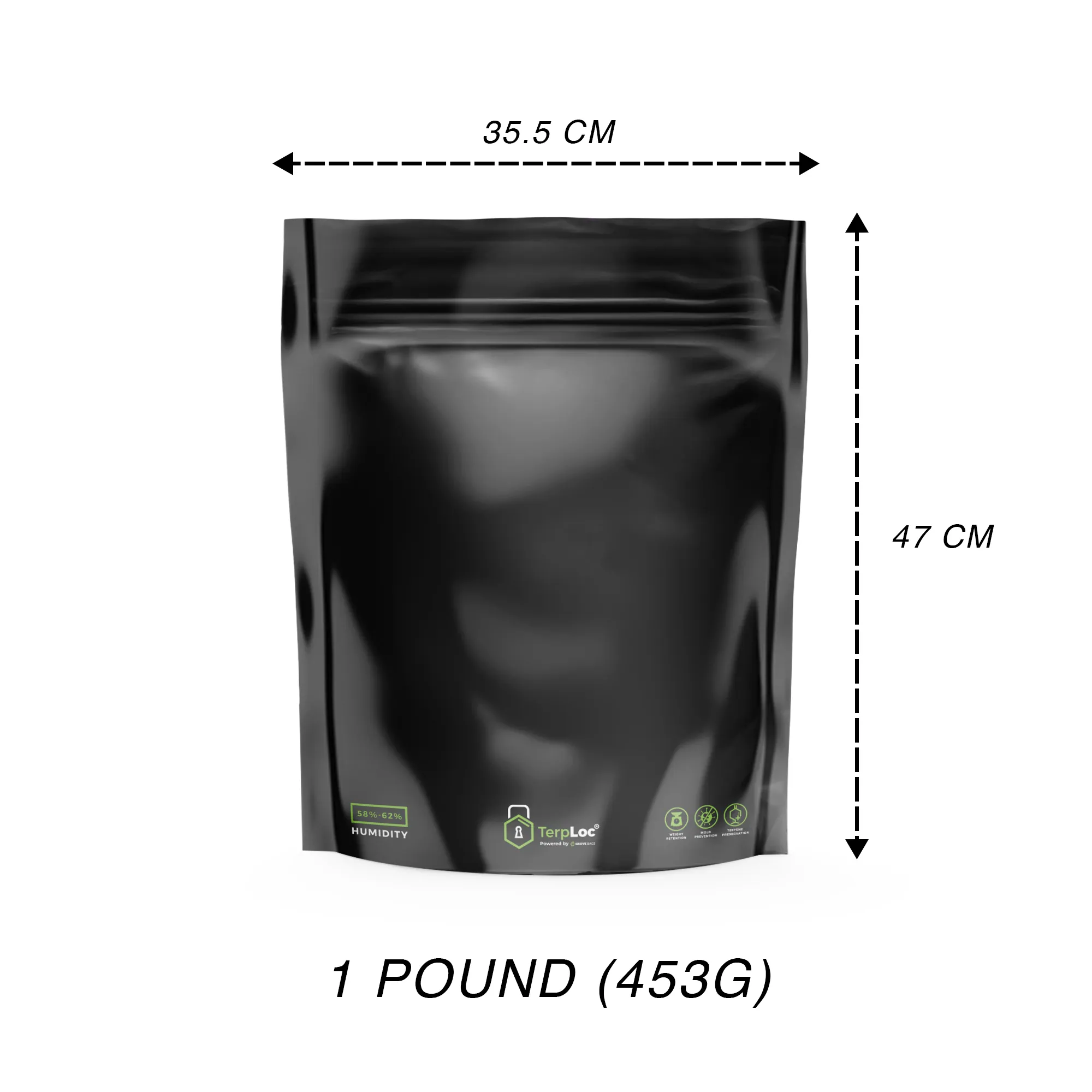 The Grovebag Opaque Terploc Bag is a specialized storage solution for cannabis and hemp, engineered with proprietary Terplocâ„¢ technology to ensure optimal curing and preservation. Its multi-layer film actively controls humidity and oxygen, blocks UV light, forms an odor barrier, and minimizes static, creating an ideal microclimate that safeguards freshness, potency, and terpene integrity by preventing degradation and trichome loss. This durable, opaque, resealable bag maintains product quality over extended periods.